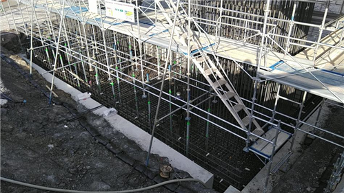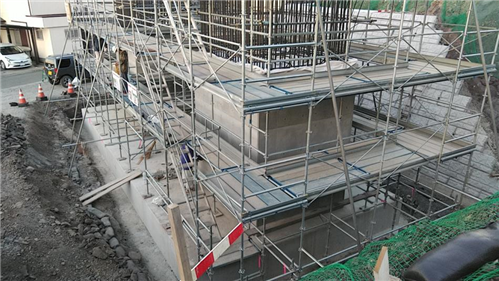 フーチングのコンクリート打設が終わり、柱の型枠を組み立てています。