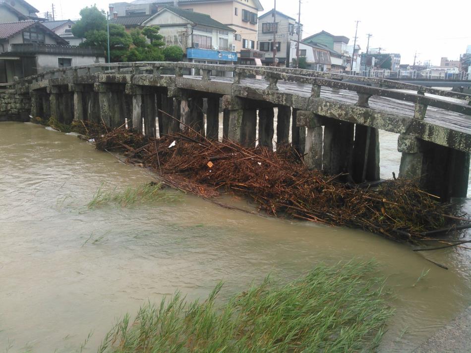 先週末から降り続いている雨で祇園橋の橋脚に流木が引っ掛かり