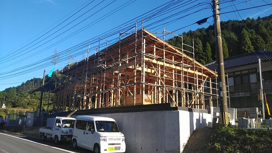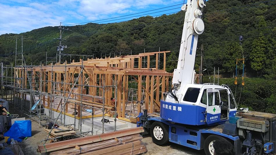 少し遡りますが、柱の建込後 梁や母屋の吊り込みを行い建て込んでいきます。