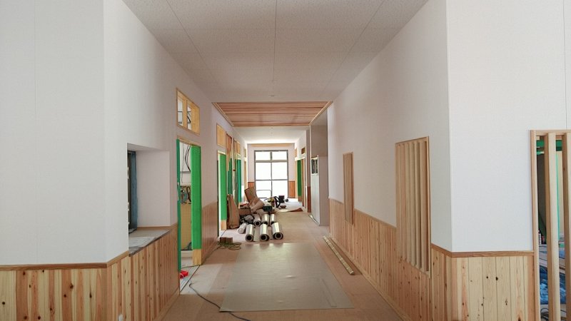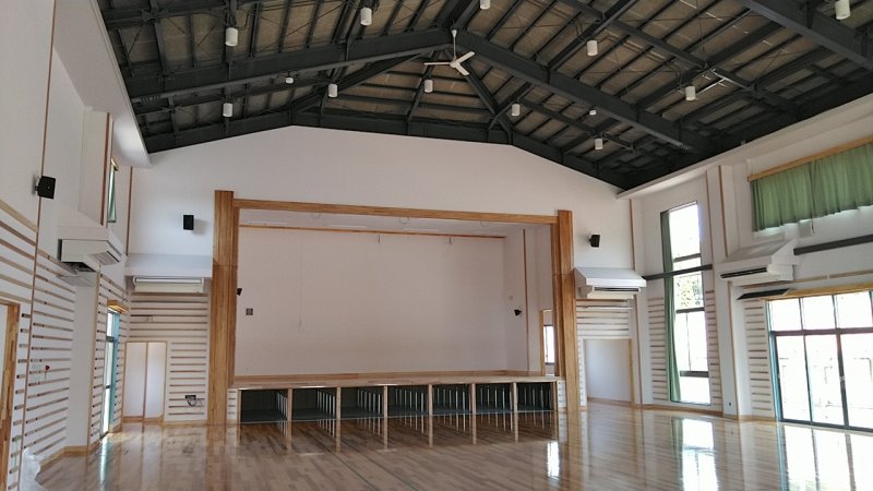 講堂はほとんど完成し、ステージの照明の配線が下がっておりました。