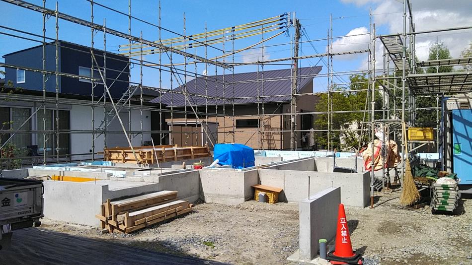 土台取付、建て方、棟上げまで進んでいますので、連休までには