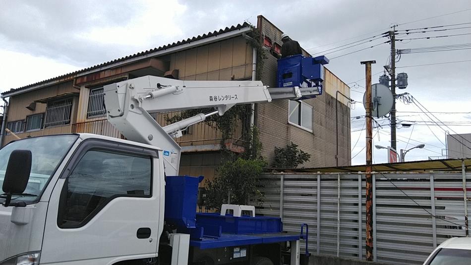 写真は屋上からの外壁修理が無理だったので、高所作業車での作業となりました。