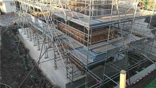 現在では、この上のイチョウ型に開いた型枠組立を行っております。