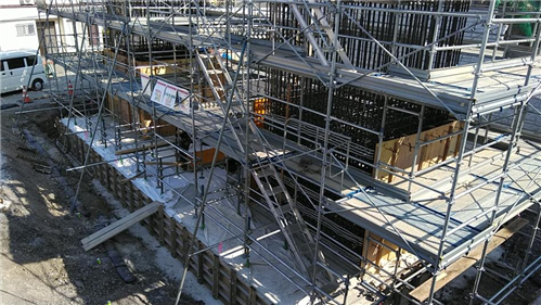 フーチングのコンクリート打設が終わり、柱の型枠を組み立てています。