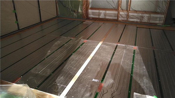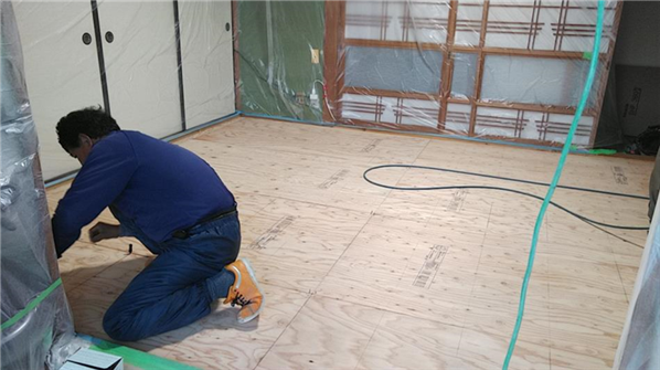 室内全面に床暖房を敷き終わり、通常のフローリングを施工します。