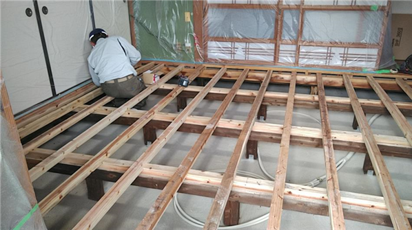 畳と床板をはがして、大引きの高さを調整、根太を設置して下地を作ります。