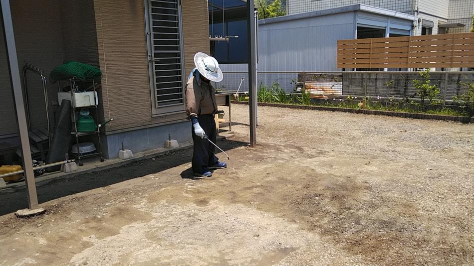 基盤の高さ調整を行った後は、入念に除草剤を散布します。
