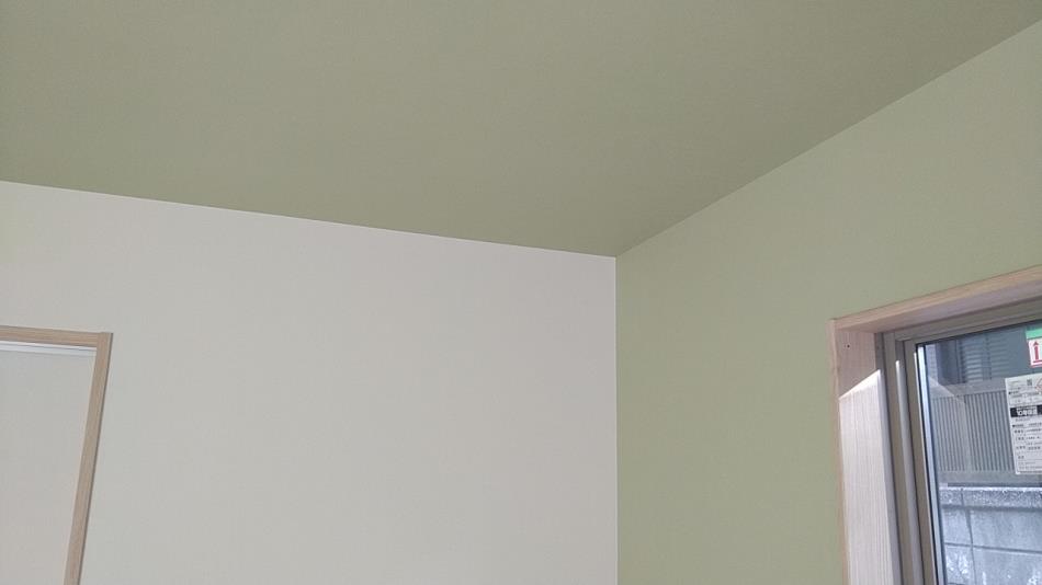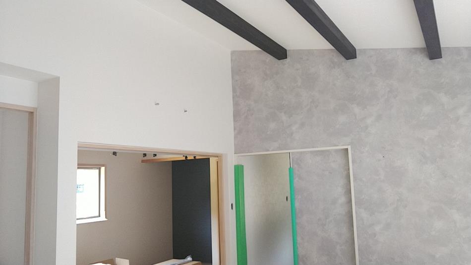 壁、天井のクロスも完了し、残すは器具付けとなりました。天井の見せ梁を色濃く仕上げ、壁の一面のみ石目調で仕上げてあります。